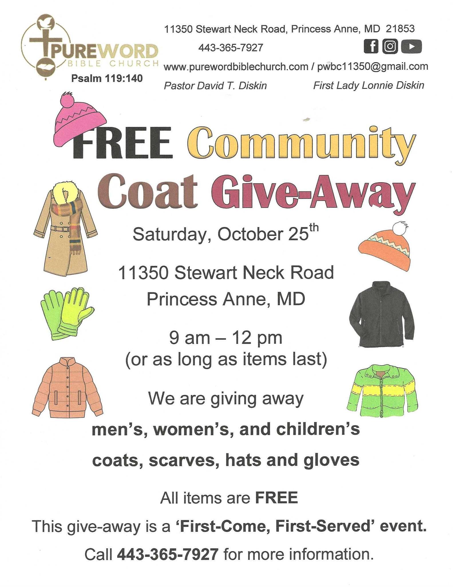 PWBC is hosting their annual FREE Community Coat Give-Away on Saturday, October 25th from 9 am - 12 pm or as long as the items last. We are giving away men's, women's, children's coats, scarves, hats, and gloves.